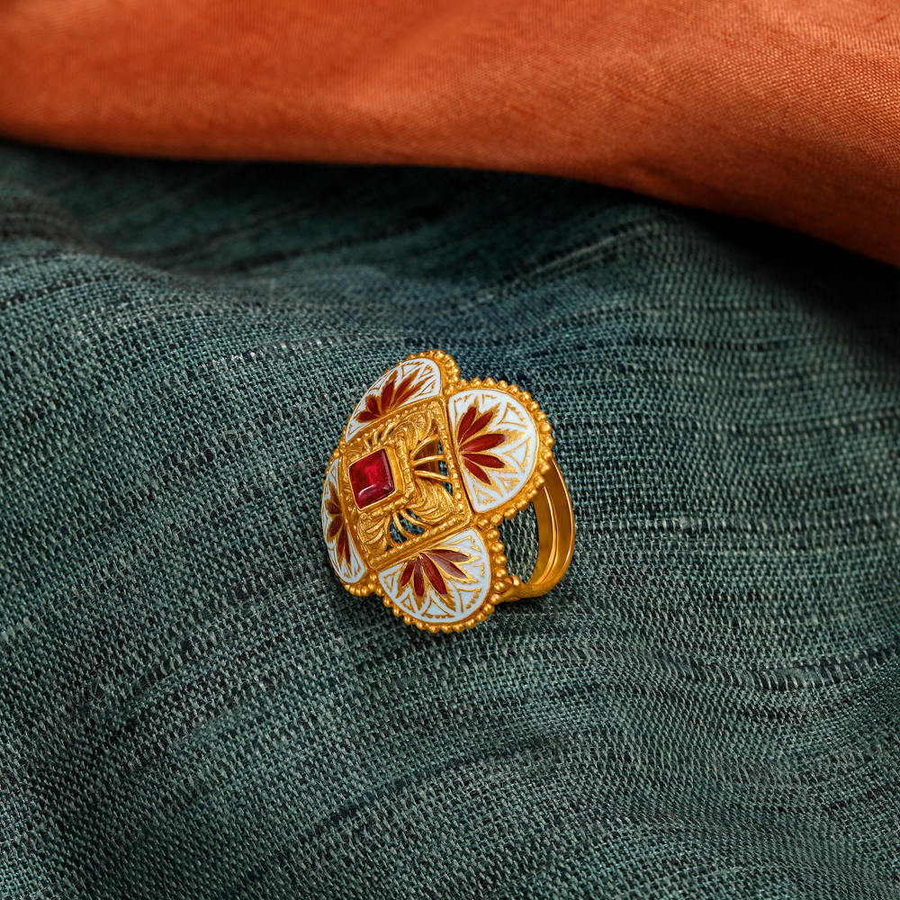 The perfect companion for traditional wear this surreal floral ring is crafted in 22 karat yellow gold, with enamel details | TANISHQ