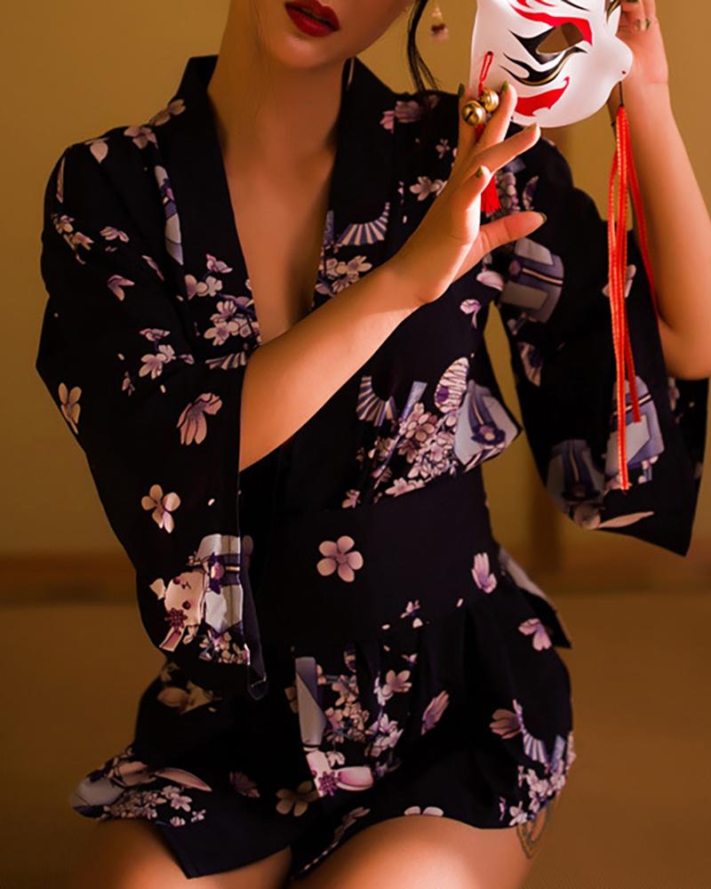 Blossom Floral Print Bell Sleeve Kimono Robe Costume, Dark blue