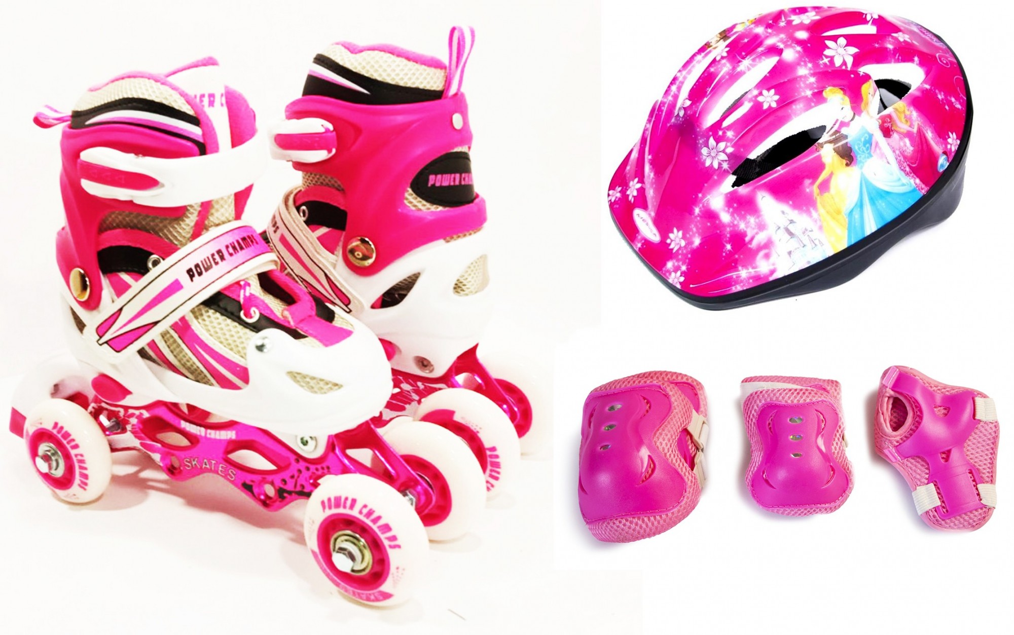 Детские ролики для начинающих квады с комплектом защиты Power Champs розовый цвет размер 29-33