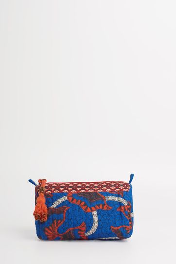Bolso tipo necessaire chico, confeccionado en algodón sublimado, con detalles de pespunte matelasée. El cierre tiene detalle de tirante de borla. Medidas: 20x17cm.