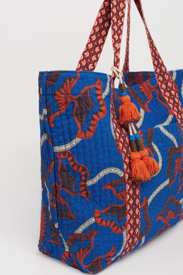 Bolso mediano tipo tote bag, confeccionado en tela de algodón sublimado, con bolsillo plaqué en el frente y acceso superior con botón magnético. Las manijas están hechas en otra estampa y cuentan con un detalle de borlas a tono que suman el toque boho. Un básico de temporada para llevar a todas partes. Medidas: 50,5x35cm