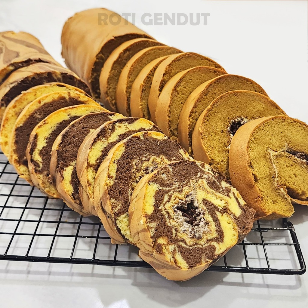 Bolu Gulung Lembut Roti Gendut– Varian Keju, Cokelat Meses, Marble, Mocca