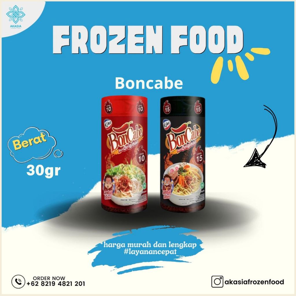 BonCabe adalah sambal tabur pertama di Indonesia yang terbuat dari cabai asli berkualitas tinggi dan diproses secara modern. Produk ini hadir dalam berbagai varian rasa dan level kepedasan, mulai dari sambal tabur, snack krispi, hingga mie goreng dan makaroni.