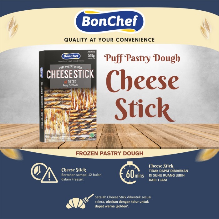 Bonchef Cheese Stick hadir sebagai solusi untuk memudahkan para chef untuk membuat adonan pastry, sudah dalam bentuk adonan beku Cheese Stick dengan isi 60 buah Cheese Stick seberat 9 gram per buah, sehingga siap dipakai untuk kreasi pastry sesuai selera chef. Cheese Stick terbuat dari bahan-bahan pilihan tanpa pengawet, sudah mempunyai sertifikasi HALAL MUI serta satu-satunya pastry di Indonesia yang diproduksi dengan standar ISO22000 SGS. Cheese Stick adalah adalah adonan beku pastry yang memudahkan anda dan menghemat waktu dalam membuat pastry cheese stick.