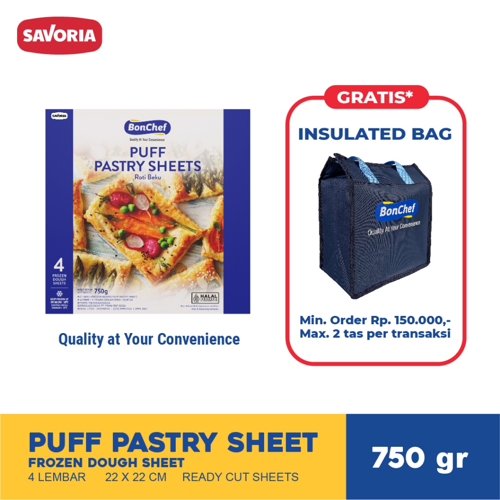 Bonchef Puff Pastry Sheet hadir sebagai solusi praktis bagi kalian pecinta pastry, khususnya puff pastry, seperti Salmon En Croute, Bolen, Banana Struddle, Pot Pie dan beragam kreasi lainnya, karena produk ini mampu menciptakan sensasi kulit pastry berlayer dengan rasa yang gurih dan renyah, terdiri dari 4 lembar berukuran 22x22 cm dengan berat per lembarnya sebesar 187,5 gram, jadi kalian tidak perlu lagi ribet membuat adonan pastrynya serta mudah disimpan kembali.