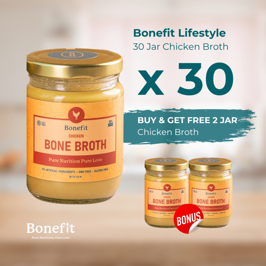 Chicken Bonefit Broth dimasak dengan menggunakan Slowcooker berbahan 316Ti Stainless Steel sehingga nutrisi optimal dan terhindar dari kontaminasi logam. Melalui Proses selama 24 jam dengan suhu 85 C.Chicken Bonefit Broth sehat untuk diminum serta bisa juga diolah sebagai soup atau varian lainnya. dan di kemas menggunakan botol jar kaca yang sudah di cuci , dipanaskan dan menggunakan mesin UV