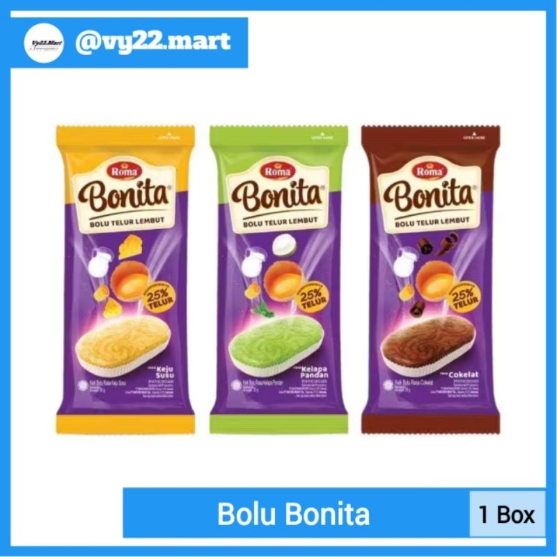 Bonita Bolu Telur Lembut adalah produk yang dijual dengan rasa cokelat, keju, dan pandan. Setiap box berisi 12 bungkus, sehingga Anda dapat menikmati kelezatan bolu telur lembut ini bersama keluarga atau teman-teman Anda.