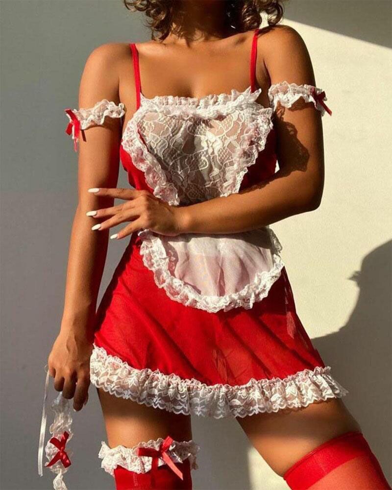 Bowknot Decor Contrast Lace Maid Costume Set, Red