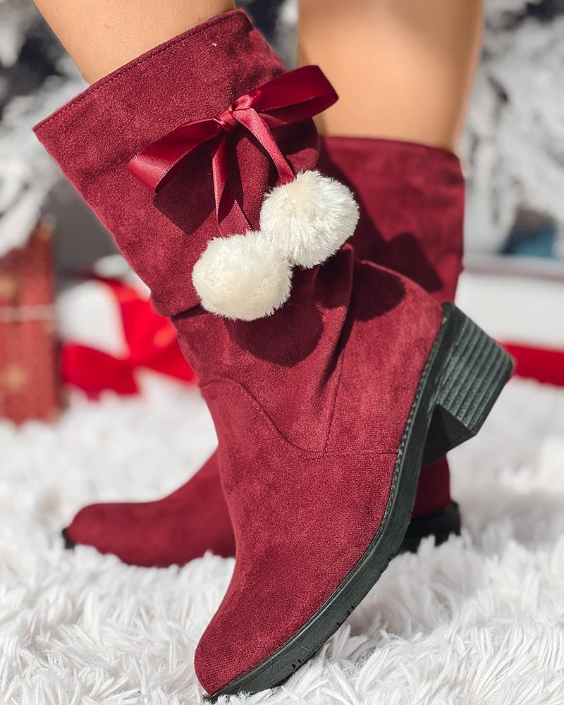 Bowknot Design Pom Pom Ruched Ankle Boots, Wine red