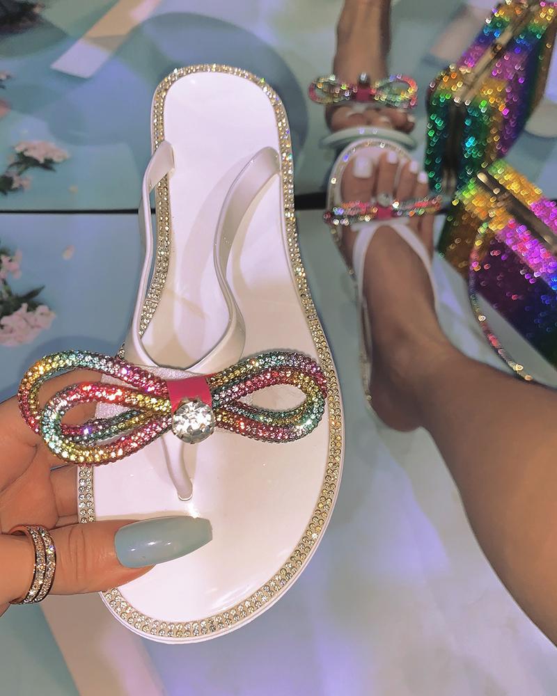 Bowknot Pattern Rhinestone Flip Flops, White