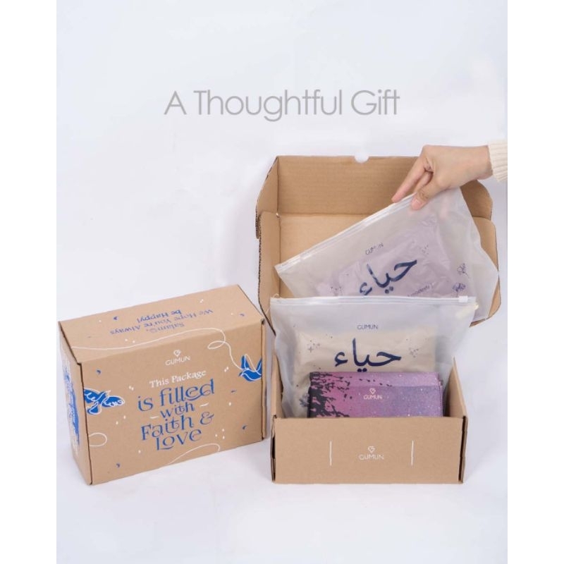 Tulisan di dalam box : Assalamualaikum Thank you for Choosing Gumun. We are happy to be able to support your journey of faith. May Allah always bless you in your life.