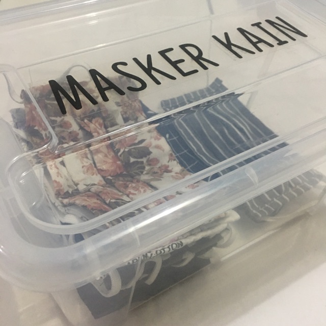 Box samla ikea utk simpan masker kain, simpan dekat pintu keluar utk memudahkan saat akan keluar menggunakan masker. Box dengan penutup (penutup tidak terkunci) dikarenakan fungsinya hanya utk menutup saja, bukan box untuk dibawa bawa. Harga sudah dengan label bertuliskan mask3r kain seperti gambar