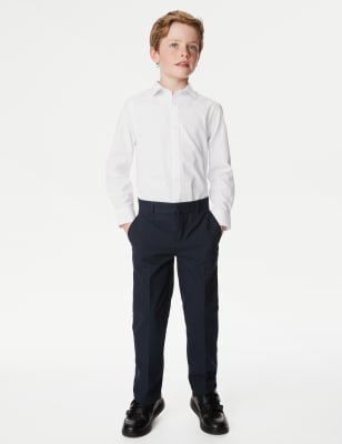 These boys' long sleeve shirts come in a longer length for taller children and feature our easy to iron technology, so they only need a quick press for a crisp finish. Expandable stretch cuffs (up to 8 years) support independent dressing by reducing fiddly fastenings. Handy pack of three. We are transitioning the polyester in this garment to recycled polyester. While we transition, customers may receive items made with either sustainable sourced cotton and recycled polyester or just sustainable sourced cotton and polyester.