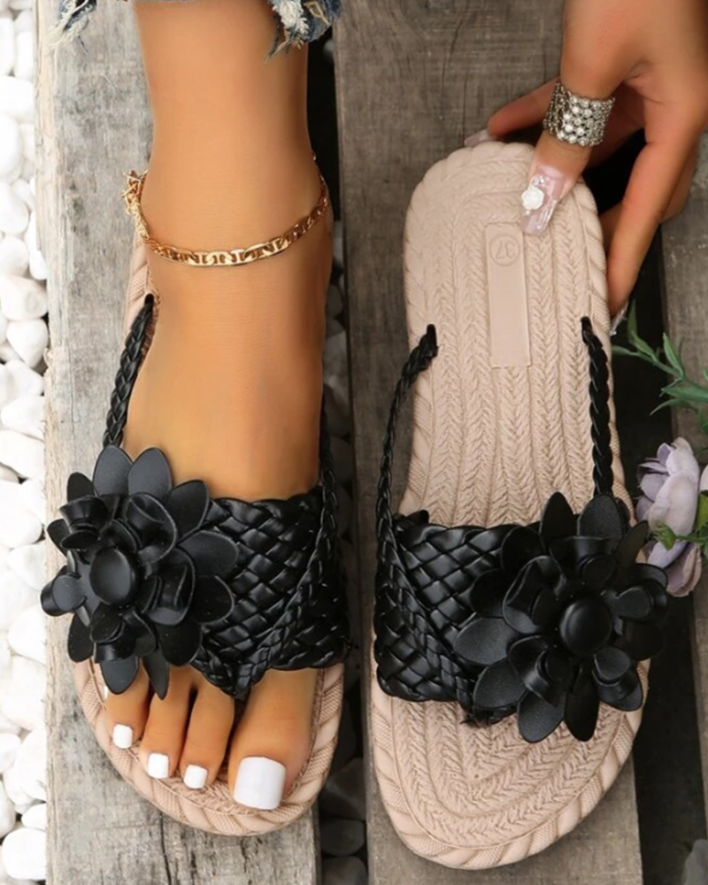 Braided Floral Pattern Toe Post Beach Flip Flops, Black