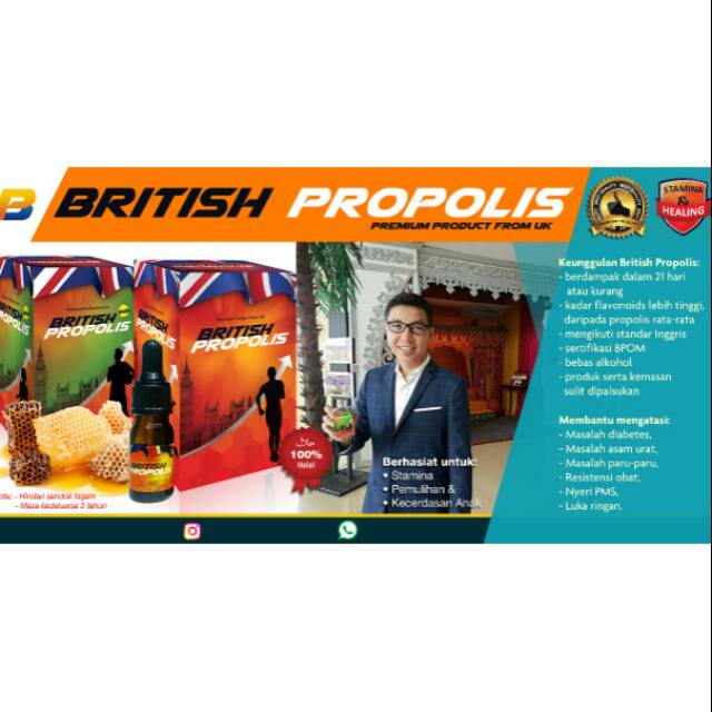 *British Propolis* adalah herbal premium product yang berkhasiat luar biasa, dan diperlukan sekitar 6.000 lebah yang bekerja setahun untuk menghasilkan satu botol British Propolis berisi 6 ml. British Propolis adalah 100% propolis.