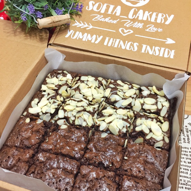 Chocolate Brownies Panggang topping mixed , 1/2 bagian Chocochips dan 1/2 bagian Almond , seperti tampak di foto, fresh from the oven. Selalu Fresh!!