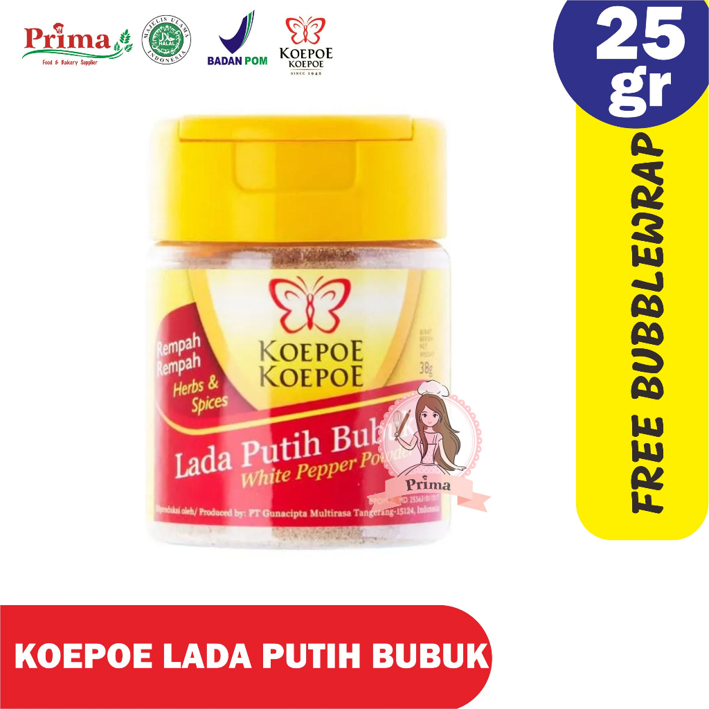 Koepoe Koepoe lada putihBubuk 25gr adalah penyedap rasa yang dibuat dari rempah asli dan bahan pilihan yang bermutu, lalu diproses menjadi bubuk kemudian dikemas dengan praktis sehingga dapat digunakan untuk segala macam keperluan memasak anda.