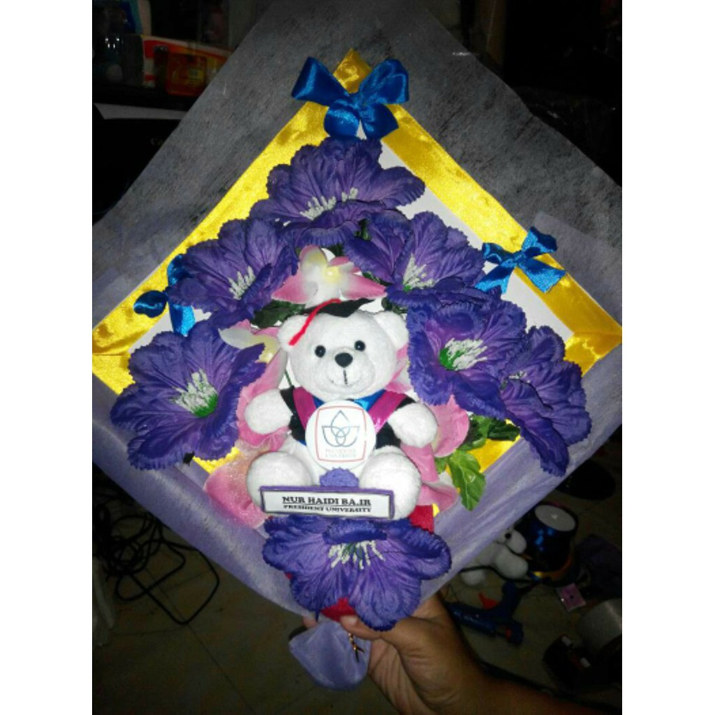 Buket Bunga + Boneka wisuda 12cm dengan Pin Kampus. (pin kampus bisa disesuaikan, warna Bunga bisa stock memungkinkan bisa di sesuai kan dengan keinginan). bisa menjadi hadiah terindah di hari istimewa orang tercinta