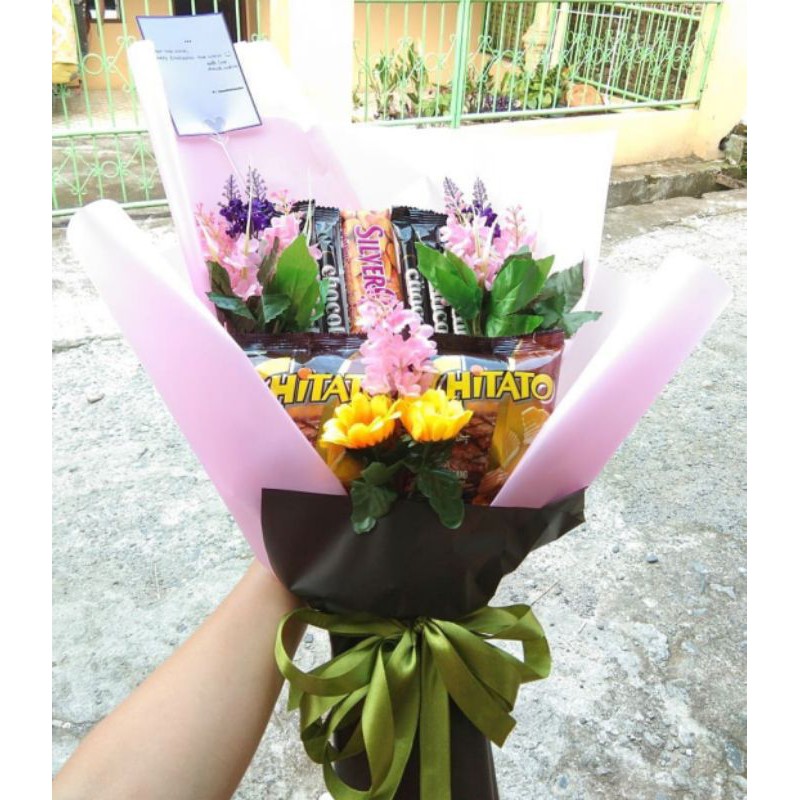 Isi buket : Coklat, varian snack, bunga (random sesuai stok. tapi jenis bunga akan disesuaikan) dan gratis kartu ucapan.
