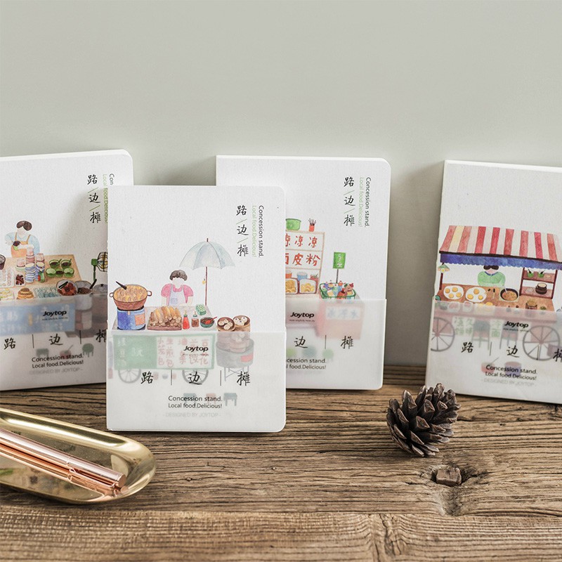 Buku catatan yang mengilustrasikan stand jajanan lokal di suatu negara/kota.