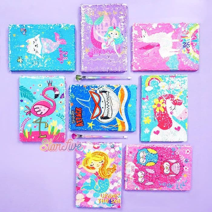 Buku NoteBook ukuran A5 yang dibungkus dengan sequin. Sequinnya bisa berubah gambar yah moms, bisa dicek dari foto postingan produk kita. Motifnya keren dengan warna yang soft. Dalamnya ada yang bergaris, ada yang polos disertai dengan gambar lucu di pojok bawah.