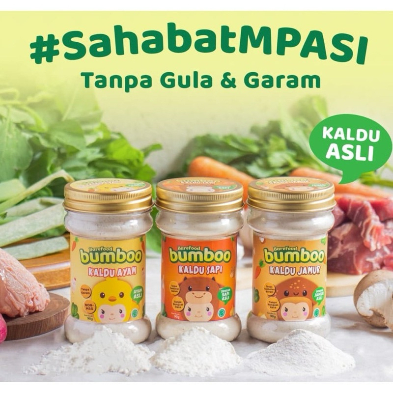Produk baru dari Barefood Bunda! BUMBOO Kaldu Anak! Dibuat dari 100% ayam & jamur asli dengan bahan alami yang aman untuk dikonsumsi. Tidak ditambahkan gula dan garam seperti kaldu non-msg lainnya sehingga lebih baik untuk si kecil yang tidak boleh mengkonsumsi terlalu banyak garam.