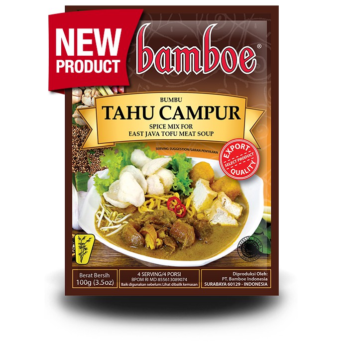 Bumbu Bamboe Tahu Campur. Tahu campur adalah salah satu makanan khas Jawa Timur, tepatnya dari kota Lamongan. Tahu campur terdiri dari sop daging sapi kenyal, tahu goreng, perkedel singkong, taoge segar, selada air segar, mi kuning, dan kerupuk udang. Semua ini kemudian dicampurkan ke bumbu petis, bawang goreng, dan sambal.