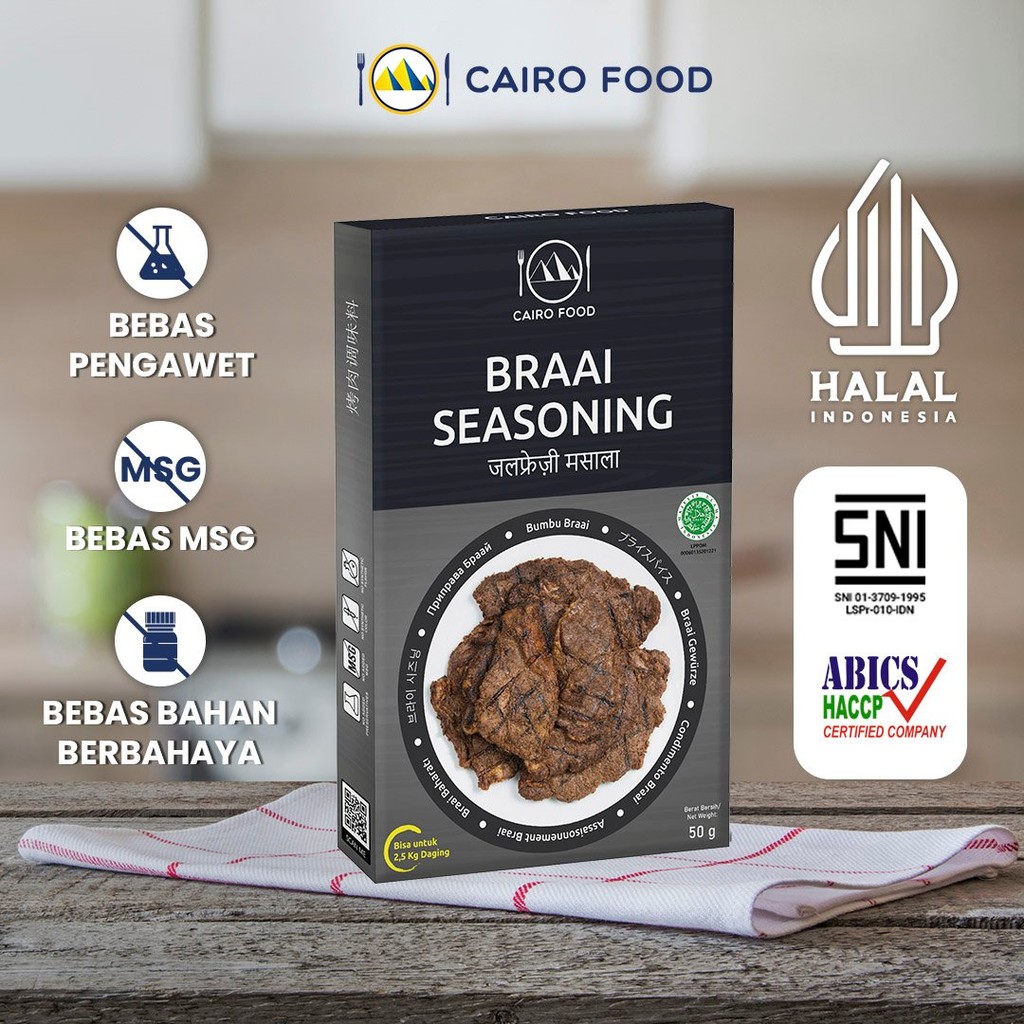 Bumbu Braai Non MSG - Cairo FoodKomposisi: Paprika, Garam Putih, Lada Hitam, Gula Putih, Thyme, Cumin, Bawang Putih, Biji Ketumbar, Bawang Bombay, Mustard Hitam, Cabai Merah, Daun Laurel
