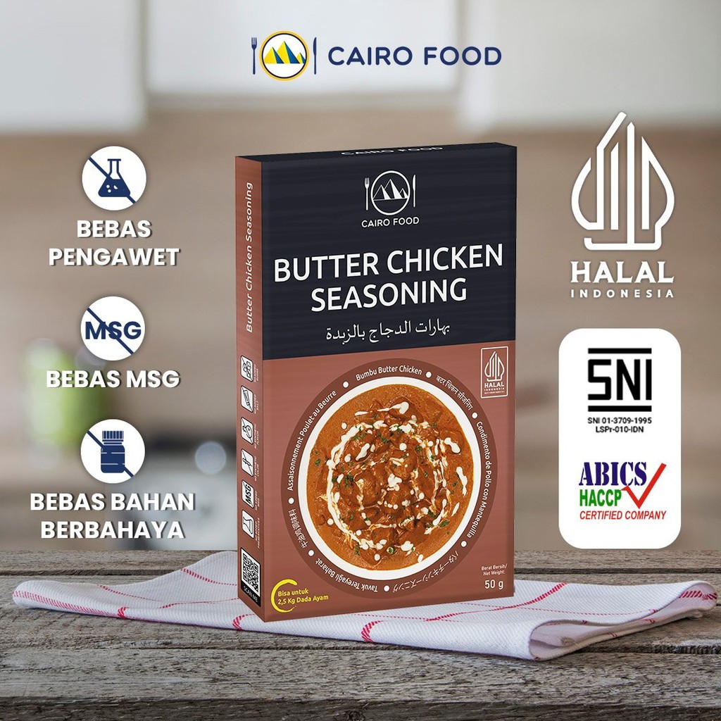 Bumbu Butter Chicken Non MSG - Cairo FoodKomposisi: Paprika, Cabai Merah, Biji Ketumbar, Cumin, Kayu Manis, Jahe Putih, Kapulaga Hijau, Cengkeh, Daun Laurel, Bawang Putih, Lada Hitam, Kunyit Kuning, Biji Kelabat, Biji Pala