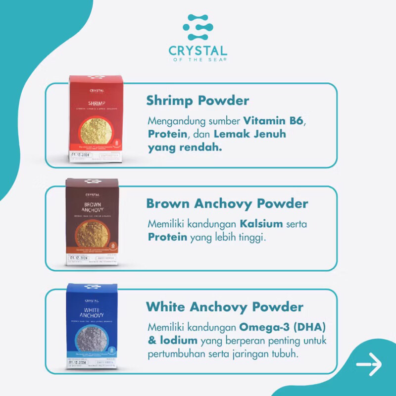 White Anchovy Powder terbuat dari Ikan Teri Nasi Premium berkualitas. Mengandung Tinggi Omega-3 (DHA), Tinggi Protein, Tinggi Iodium & Kalsium yang baik untuk pertumbuhan tulang dan gigi serta berperan penting untuk pertumbuhan & perkembangan otak serta jaringan tubuh anak.