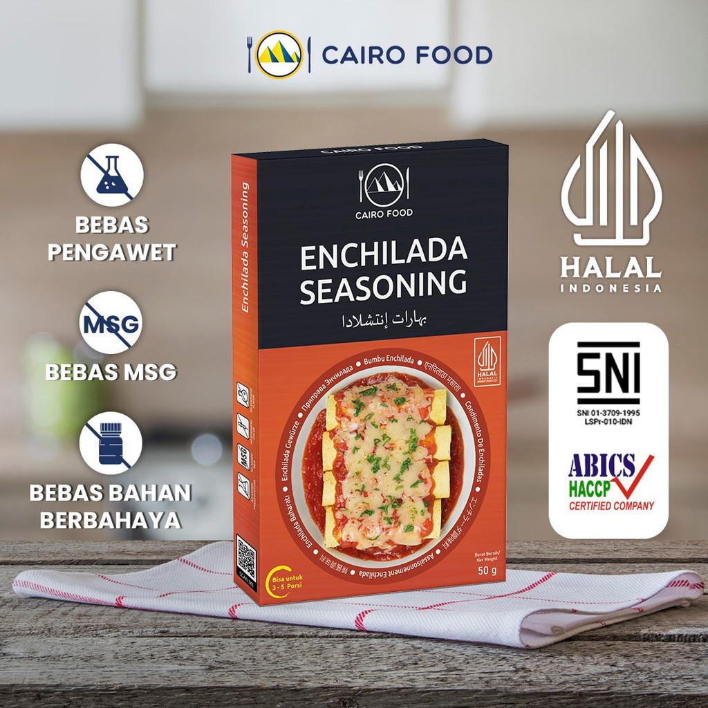 Bumbu Enchilada Non MSG - Cairo FoodKomposisi: Cabai Merah, Paprika, Cumin, Gula Putih, Garam Putih, Bawang Putih, Bawang Bombay, Oregano, Biji Ketumbar, Lada Hitam, Daun Laurel