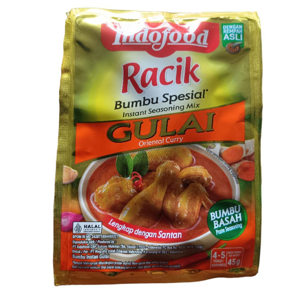 Indofood Racik Bumbu Spesial Gulai adalah bumbu instan praktis yang dirancang untuk menghadirkan cita rasa gulai khas Indonesia dengan mudah dan cepat. Dibuat dari perpaduan rempah-rempah alami pilihan seperti kunyit, kemiri, ketumbar, dan jahe, serta santan berkualitas, bumbu ini menghasilkan gulai dengan kuah kental, gurih, dan aroma rempah yang kaya. Tanpa bahan pengawet dan pewarna sintetis, Indofood Racik Gulai menawarkan kelezatan autentik yang cocok untuk berbagai jenis daging atau sayuran.