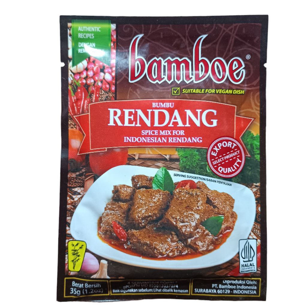 Bumbu instan **Bamboe Rendang 35gr** adalah bumbu siap pakai untuk membuat rendang, hidangan khas Minangkabau dengan cita rasa pedas, gurih, dan kaya rempah. Bumbu ini berbentuk pasta basah, terbuat dari bahan-bahan alami seperti bawang merah, bawang putih, cabai, jahe, lengkuas, kunyit, serai, daun jeruk, ketumbar, garam, gula, dan minyak nabati, tanpa tambahan pewarna buatan, esens, atau pengawet. Produk ini bersertifikat halal oleh MUI dan terdaftar di BPOM, menjamin kualitas dan keamanan konsumsi.