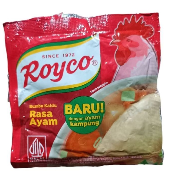 Royco Kaldu Rasa Ayam Kampung 8gr adalah bumbu penyedap serbaguna dari PT Unilever Indonesia dalam kemasan sachet kecil, dirancang untuk memperkaya cita rasa masakan dengan aroma dan rasa ayam kampung yang autentik dan gurih. Dibuat dari kaldu ayam kampung asli yang direbus lama dan dipadukan dengan kombinasi enam bahan dan rempah berkualitas seperti bawang, lada putih, kunyit, dan seledri, produk ini menghasilkan kaldu mantap yang mudah larut. Komposisi utamanya meliputi garam, penguat rasa (mononatrium glutamat, dinatrium inosinat, dan guanilat), dekstrin, pati jagung, lemak nabati, perisa ayam (mengandung telur, antioksidan tokoferol), bawang, asam sitrat (pengatur keasaman), anti kempal silikon dioksida, daging ayam, ekstrak daging ayam (0,04%), seledri, dan pewarna tartrazin CI 19140. Cocok untuk berbagai hidangan seperti ayam goreng (1 sdm untuk ungkep 1 kg ayam), sup ayam, tempe goreng, ikan goreng, atau masakan berkuah dan tumisan, Royco Ayam Kampung memberikan rasa umami yang kaya dan warna menarik. Dikemas dalam sachet 8 gram (biasanya dijual dalam renceng isi 12 sachet), produk ini bersertifikasi halal, terdaftar di BPOM (No. MD 655610917024).