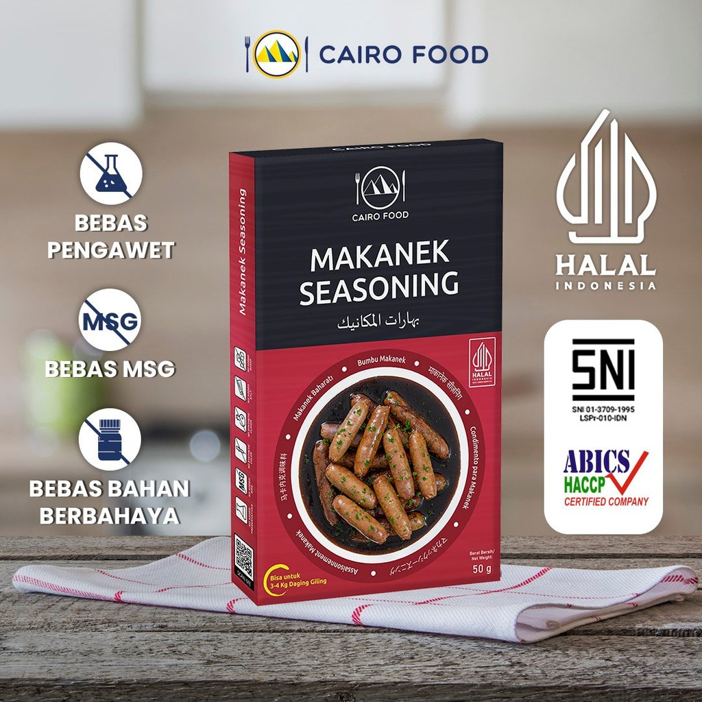 Bumbu Makanek Non MSG - Cairo FoodKomposisi: Biji Ketumbar, Lada Hitam, Allspice, Kayumanis, Bawang Putih, Biji Pala, Jahe Putih, Cengkeh, Cumin, Daun Laurel, Cabai Merah