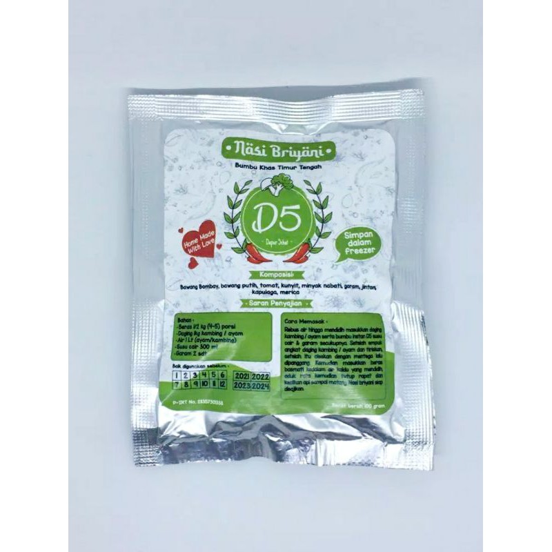 Rebus air hingga mendidih masukkan daging kambing / ayam serta bumbu instan D5 susu cair & garam secukupnya. Setelah empuk angkat daging kambing / ayam dan tiriskan, setelah itu oleskan dengan mentega lalu dipanggang. Kemudian masukkan beras basmati kedalam air kaldu yang mendidih, aduk rata kemudian tutup rapat dan kecilkan api sampai matang. Nasi biryani siap untuk disajikan.
