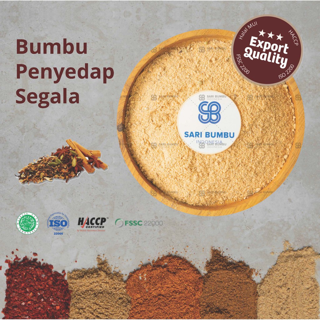 Bumbu Penyedap Segala yang di proses dengan sangat higienis dengan standar mutu Internasional. Bumbu Penyedap Segala ini murni tanpa campuran dan melewati 3 tahapan pembersihan dengan mesin standar produksi untuk Ekspor ke Jepang. Cita rasa original dengan aroma yang berkelas membuat Bumbu Penyedap Segala ini biasa digunakan untuk penggunaan Industri Makanan (Bumbu), Pengemasan ulang retail, Produk F&B, Restaurant, Makanan Cepat Saji, Kafe, Bakery, Penggunaan Rumah tangga.