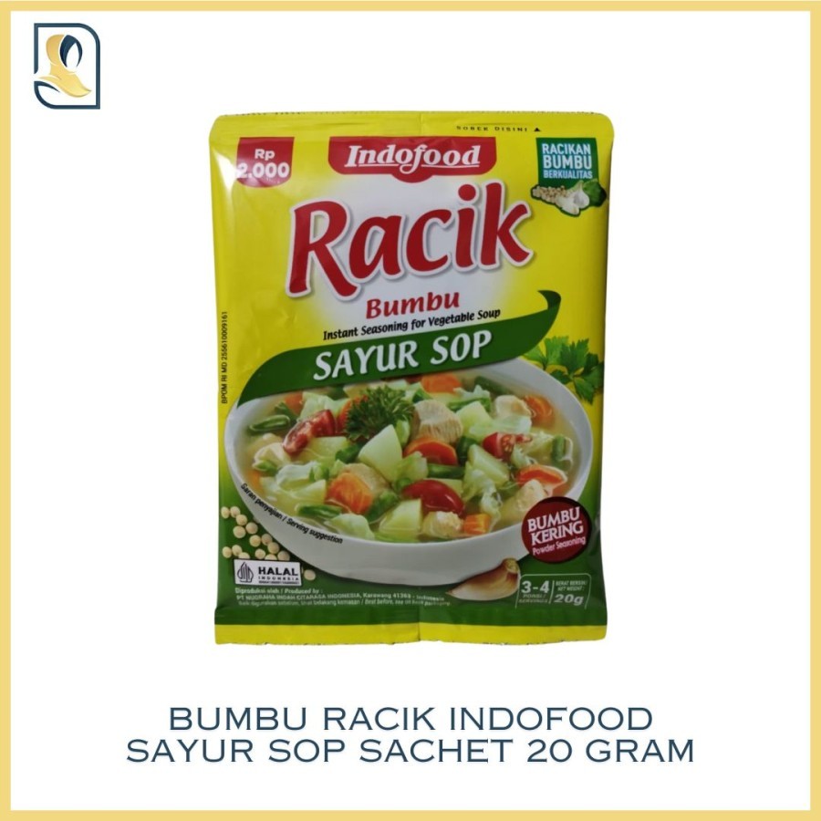 Indofood Racik Sayur Sop merupakan bumbu instan untuk memasak sayur sop yang berasal dari bahan-bahan berkualitas pilihan. Bumbu ini terbuat dari garam, penguat rasa, gula, dekstrin, bumbu dan rempah-rempah, perisa artifisial daging ayam, dan ekstrak ragi. Indofood Racik Sayur Sop tidak mengandung bahan pengawet dan pewarna buatan sehingga aman untuk dikonsumsi oleh anggota keluarga.