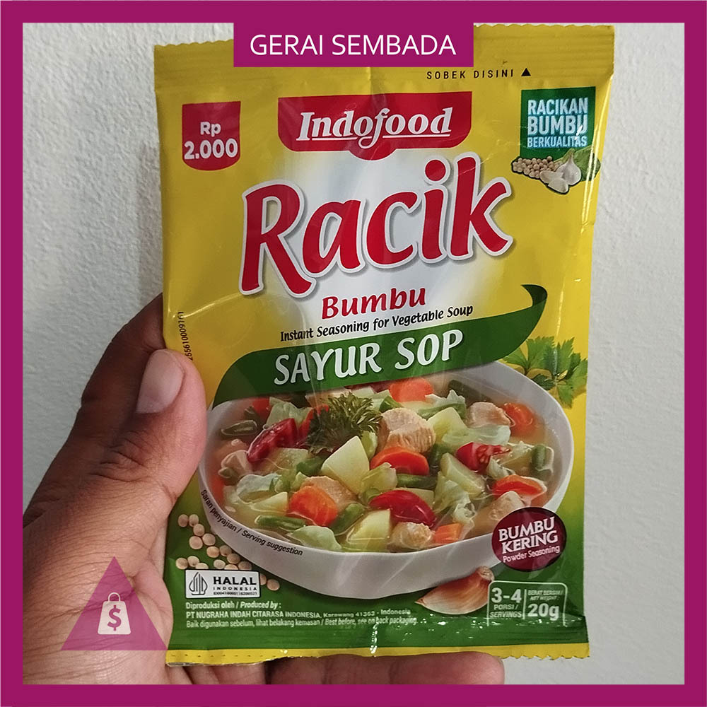 1 bungkus Bumbu RACIK Sayur Sop cukup untuk 1x masak untuk 3-4 porsi. Cocok untuk aneka jenis sop seperti sop ayam, sop jagung, sop makaroni, dan kreasi sop favorit keluarga.
