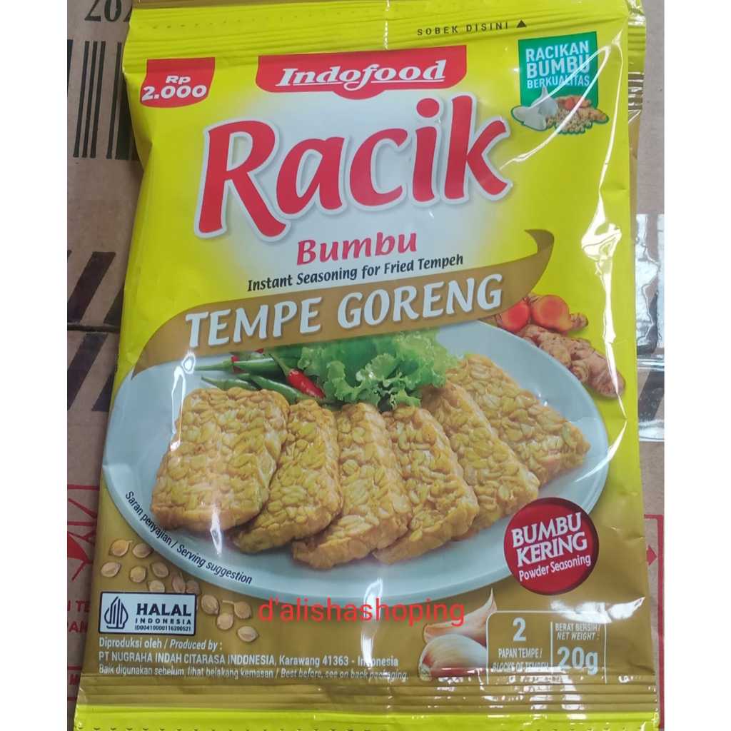 Indofood Racik Tempe Goreng merupakan tepung bumbu instan yang dapat digunakan untuk menggoreng tempe dengan sangat praktis. Indofood Racik Tempe Goreng terbuat dari racikan bumbu berkualitas tanpa pengawet dan pewarna sintetis sehingga dapat menghasilkan tempe goreng yang renyah, gurih dan lezat, serta aman digunakan karena telah bersertifikat halal dan sudah terdaftar resmi di BPOM.