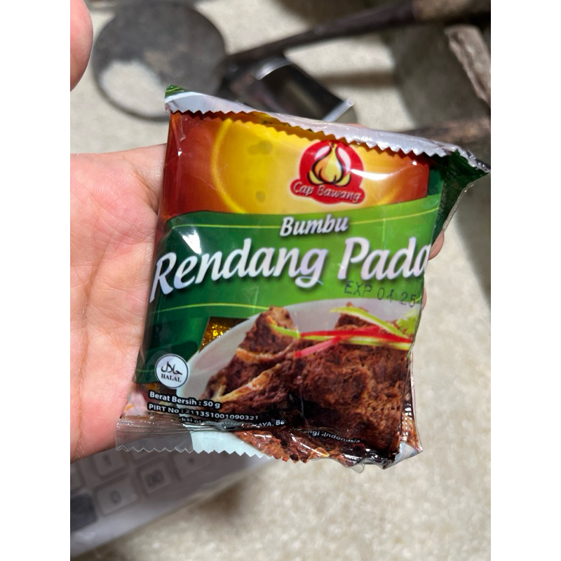 Cara memasak : Siapkan 250 Gram daging sapi dan 1 gelas santan kanil. Rebus daging sampai empuk lalu potong-potong. Sisakan air rebusan sebanyak 1 gelas. Masukkan 1 bungkus BUMBU RENDANG CAP BAWANG ke dalam air rebusan daging bersama santan kanil. Aduk rata, kecilkan apinya, masak sampai bumbu meresap.