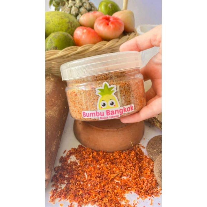 Bumbu bangkok, merupakan perpaduan antara gula merah ,gula pasir,cabai kering dan terasi yang dibuat dadakan, tanpa pengawet, home made, dengan rasa pedas, manis, gurih terasi apalagi dipadukan dengan berbagai jenis buah yang digemari bumil, juga cocok dibawa kemana pun. sangat cocok sebagai toping untuk kalian yang suka ngemil buah buahan pasti tambah nikmat deh, juga tersedia berbagai macam rujak, asinan, dan manisan
