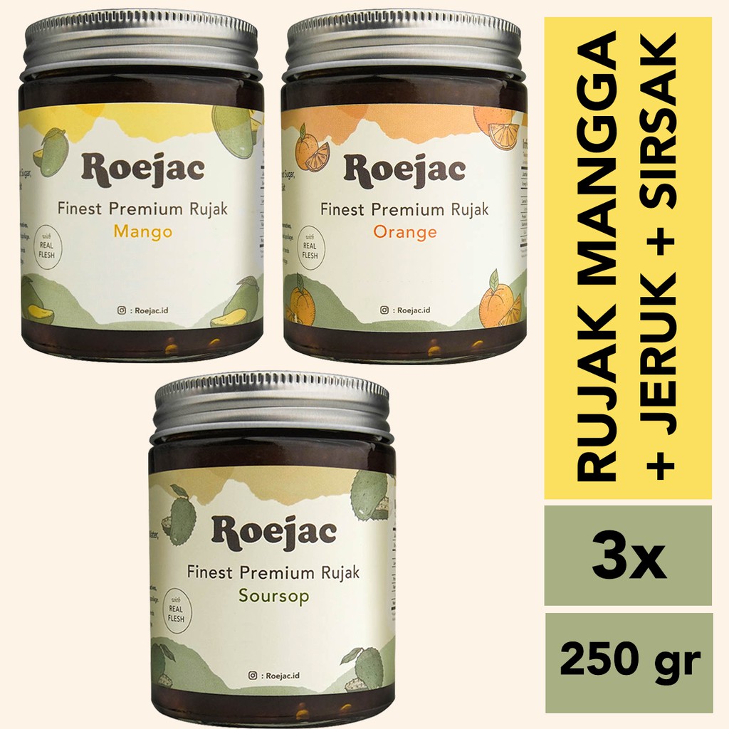 Bumbu Rujak dari Buah Asli Roejac terbuat dari buah Sirsak, Jeruk, Mangga Organik, asli dengan sensasi asam manis pedas yang cocok untuk #temanmakanbuah.