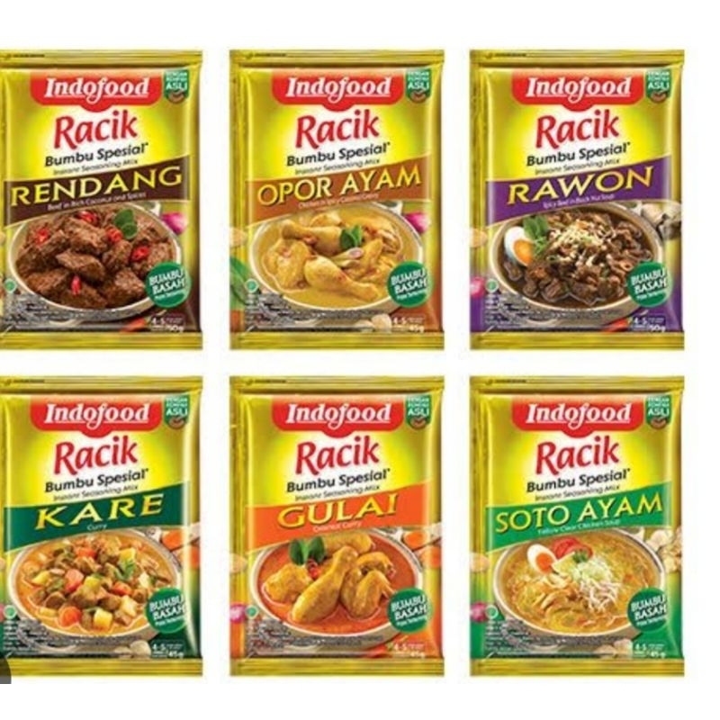 Bumbu Spesial Racik Indofood tersedia 4 rasa,,,Gulai, Rendang, soto dan kare,,,di jual per 1 bungkus isi 50 g, bumbu instant gurih dan nikmat,,,,yuk di order