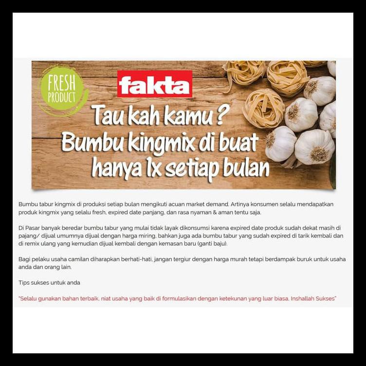 Kingmix terjaga kualitasnya dan aman dikonsumsi oleh anak-anak. banyak digunakan oleh industri/pabrik chiki,snack yang ada di mini market.