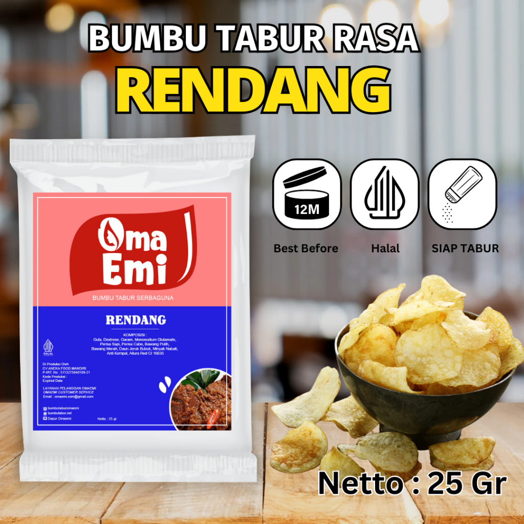 Bumbu Tabur Rendang ini memiliki rasa rempah-rempah, rendang daging dari padang yang pedas dan gurih. Bumbu Rendang sangat cocok digunakan taburan rasa aneka keripik, (seperti keripik singkong, keripik usus, keripik kentang, keripik jamur, keripik tempe, rengginang, kerupuk cumi, macaroni, lidi, dll). Atau dapat ditaburkan di berbagai macam cemilan / gorengan (seperti kentang goreng, snack kulit ikan, tahu bulat, bakso goreng, singkong, pangsit, dll).