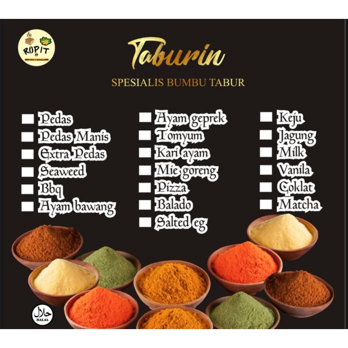 Bumbu ini memiliki rasa rumput laut yang asin dan gurih. Bumbu Tabur Seaweed sangat cocok digunakan taburan rasa aneka keripik, (seperti keripik singkong, keripik usus, keripik kentang, keripik jamur, keripik tempe, rengginang, kerupuk cumi, macaroni, lidi, dll). Atau dapat ditaburkan di berbagai macam cemilan / gorengan (seperti kentang goreng, snack kulit ikan, tahu bulat, bakso goreng, singkong, pangsit, dll)..
