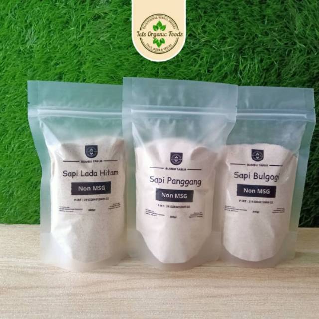 bumbu tabur non MSG tanpa penyedap rasa dan tanpa bahan pengawet. Bumbu tabur daging sapi non MSG merupakan bumbu dengan rasa beef barbeque yang khas dan dipadukan dengan rasa manis dan gurih. Rasa gurih yang dihasilkan bukan berasal dari MSG atau Monosodium glutamate, melainkan dari perpaduan berbagai rempah-rempah, ekstrak daging sapi, dan bumbu-bumbu lainnya. bumbu disajikan dalam warna putih kekuningan yang menggambarkan rasa gurih.