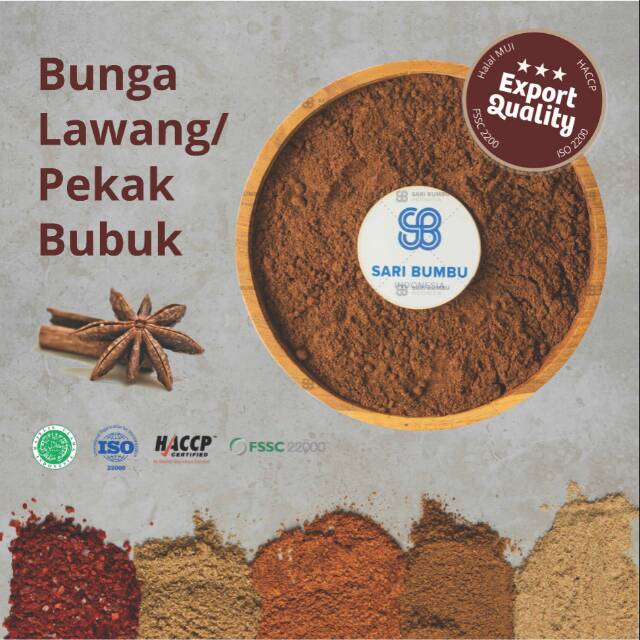 Bunga lawang yang di proses dengan sangat higienis dengan standar mutu Internasional.kembang lawang atau “pekak”, bahan dasar ini nggak cuma terkenal sebagai pelengkap bumbu masakan nusantara tapi juga di berbagai negara lainnya di Asia. Berbentuk bunga berwarna cokelat tua, dan biasa digunakan untuk memberi rasa gurih pada masakan Cina dan Indonesia. Dijual dalam bentuk kering, Hanya dengan beberapa kelopak saja rasanya sudah cukup kuat: Contoh menu masakan Cakar ayam bumbu merah.