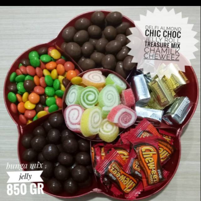 Bunga mix jelly 850gr. Isinya Delfi almond, chicchoc, jelly roll, treasure milk, ChaCha milk, cheweez